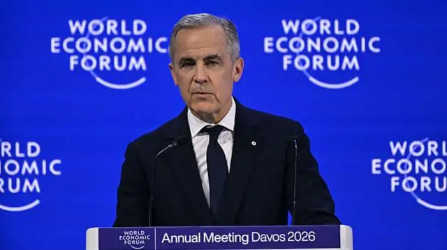Карни призывает другие страны найти способы объединиться и противостоять США при Трампе. Выступая в Давосе до Трампа, канадский премьер сказал, что "средние державы должны действовать сообща, потому что если вы не за столом, то вы в меню", и предупредил о принуждении со стороны великих держав - не упоминая имени Трампа.